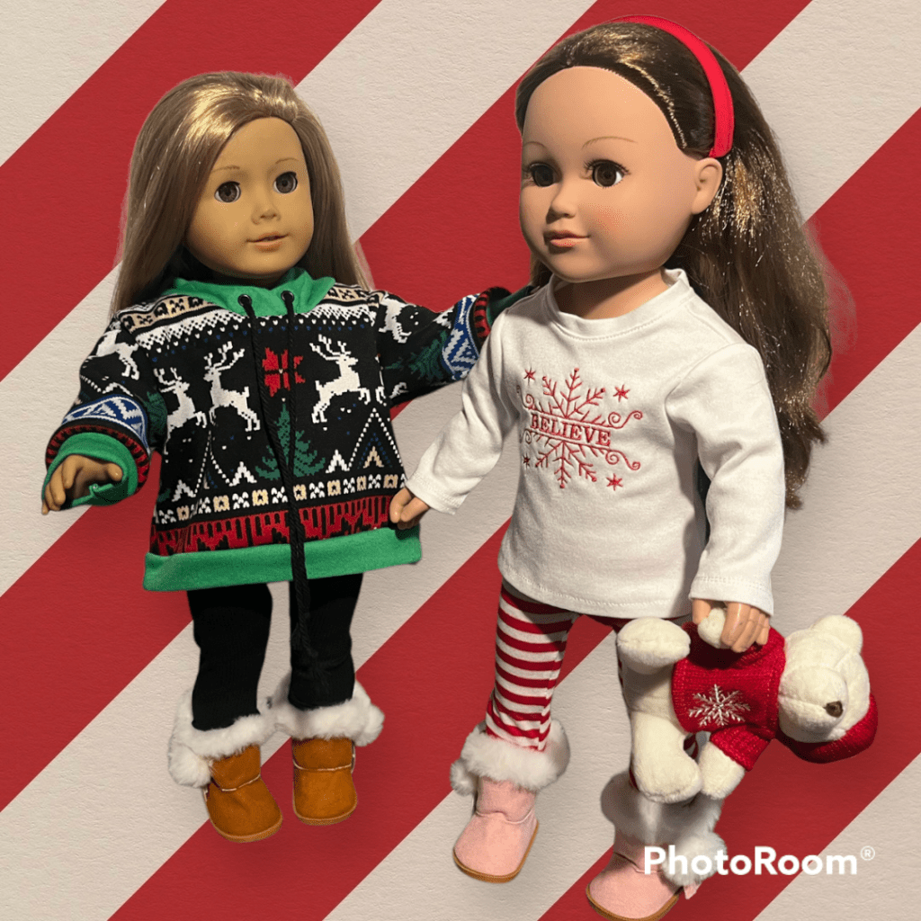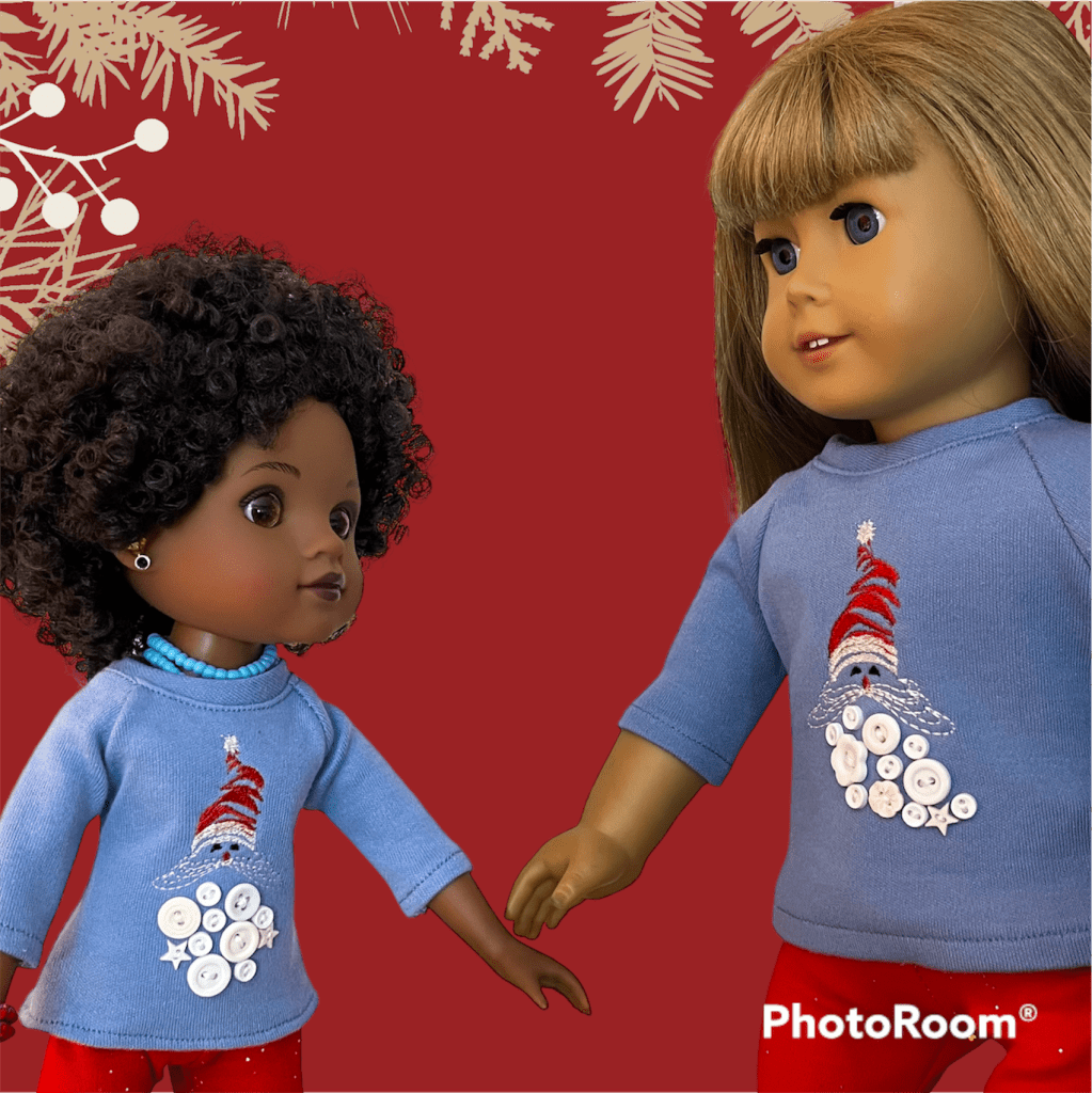 But, you can win them! I had fun digitizing this embroidery design from scratch, and not so much fun sewing all of the buttons on by hand*. I saw a similar shirt in a catalog, and realized that I wanted to replicate this holiday look for the dolls. To enter for a chance to win the outfit (shirt and leggings) for either the 18″ or 14″ doll size, please like this website post, and comment below about 1) why you like Fashion Pece’s doll clothes and 2) which size outfit you’d like to win. Then, if you haven’t already done so, please like my Facebook page. Once you’ve done all three of these things, I’ll assign you a number. I will use a random number generator to choose the winners and post the drawing on Facebook on December 22 and let you know if you’re a winner! Good luck!